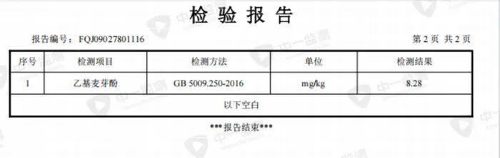 王海团队提供的检测报告涵盖多个生产批次。报告显示,2025年8月29日生产的样品中,乙基麦芽酚检出含量为7.67mg/kg;5月24日生产的样品检出值为8.28mg/kg。另一份送检样品的检出含量为7.88mg/kg。