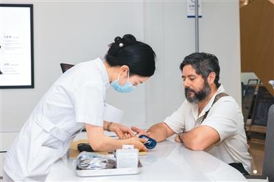 2025年5月14日,外国体验者在湖南省长沙市三诺健康糖尿病门诊体验慢病多指标快速检测。 受访者供图