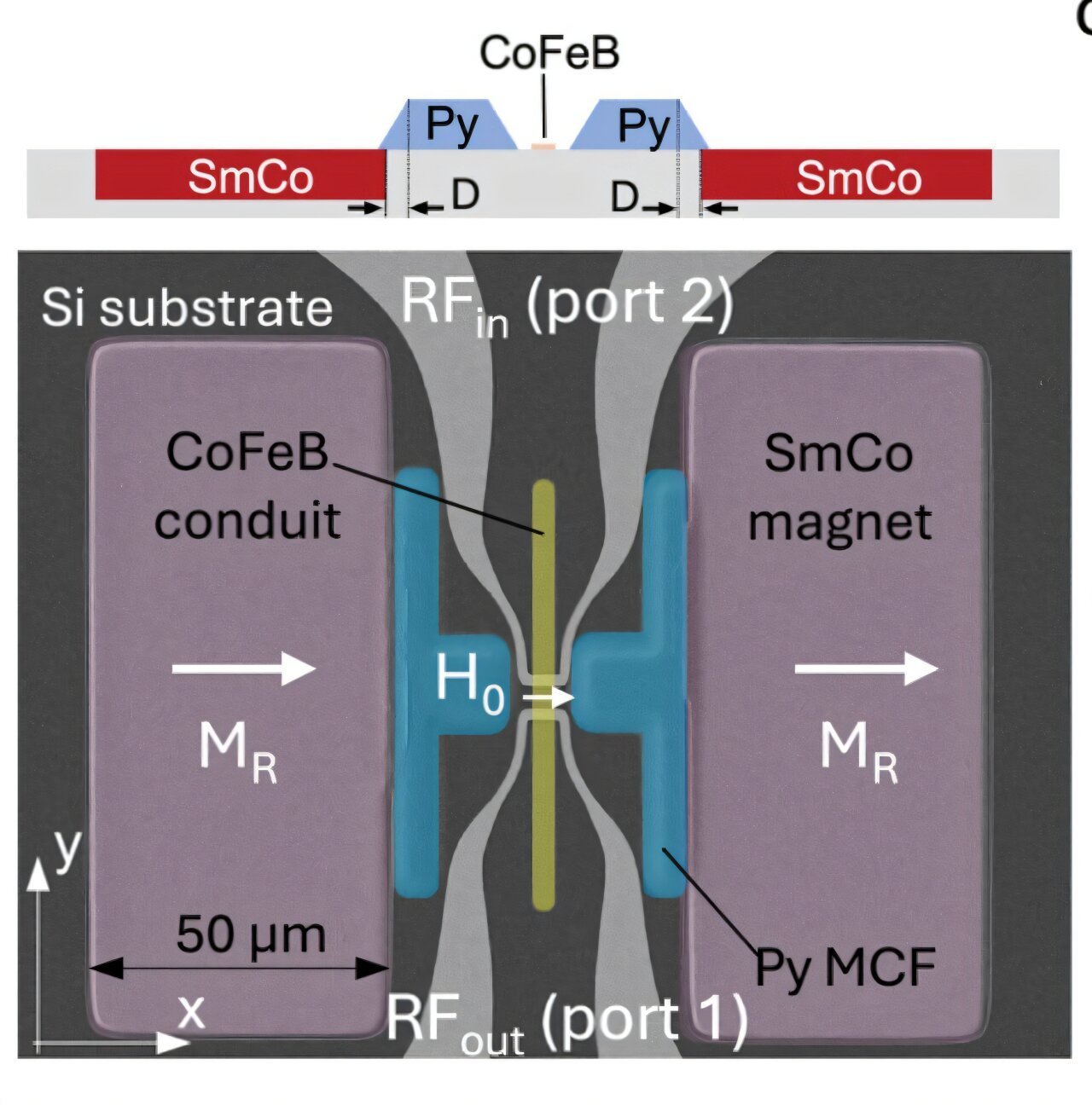 从尺寸上看,该器件仅为100×150平方微米,明显小于目前常见的基于声波的射频信号处理器件。器件核心是一条由磁性材料制成的自旋波导,并配备输入和输出天线,用于射频信号的输入与读取。通过精确调节微磁体与磁通集中器之间的距离,横向磁场强度可在11至20.5毫特斯拉范围内连续变化。