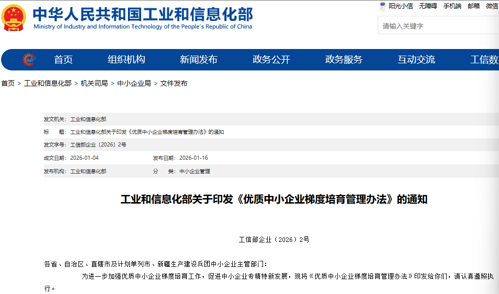 【环球网财经综合报道】工业和信息化部正式修订发布了《优质中小企业梯度培育管理办法》以下简称《办法》,目的在于进一步完善认定标准与管理服务机制,更好地发挥优质中小企业在示范带动和固基强链方面的作用。该新规将于2026年4月1日起正式实施,对现行中小企业培育体系进行了全面升级,其中最引人注目的变化在于,首次将科技型中小企业正式纳入梯度培育范围,构建起包含科技和创新型中小企业、专精特新中小企业、专精特新“小巨人”企业在内的完整金字塔梯队。
