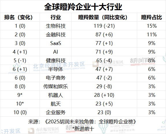胡润集团董事长兼首席调研官胡润表示:“上榜的瞪羚企业非常年轻,平均年龄只有9岁,但它们的企业平均估值已经达到7亿美元。就行业来看,生物科技(119家)和健康科技(65家)是下一代独角兽企业可能产生的热门行业。医疗设备、生物科技和数字健康领域的创新正在改变疾病治疗、诊断和患者护理。此外,金融科技和SaaS行业也是未来独角兽的重要来源。”