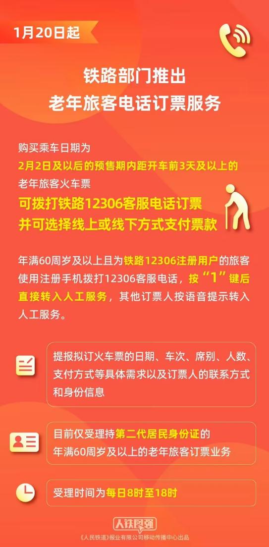 【环球网科技综合报道】1月21日消息,据“中国铁路”消息,为进一步便利老年旅客出行,满足老年群体春运购票需求,中国铁路今日起在现有订票渠道基础上,正式新增老年旅客专属电话订票服务,为60岁及以上老年旅客提供更贴心、更便捷的购票选择。