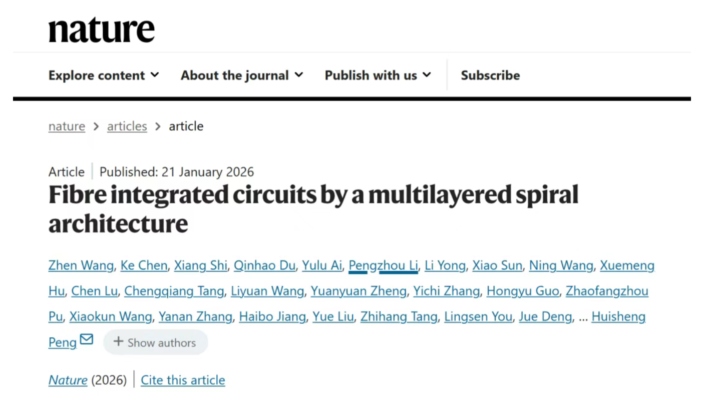该成果于北京时间1月22日凌晨以《基于多层旋叠架构的纤维集成电路》(“Fibre integrated circuits by multilayered spiral architecture”)为题,发表于《自然》(Nature)期刊,有望为脑机接口、电子织物、虚拟现实等新兴产业提供强有力的技术支撑。