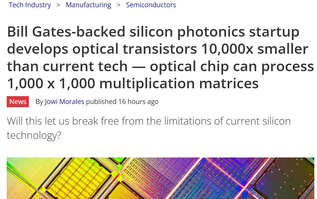 【环球网科技综合报道】1月27日消息,据tomshardware报道称,由比尔·盖茨旗下盖茨前沿基金(Gates Frontier Fund)投资支持的人工智能芯片初创公司Neurophos宣布,其在硅光子学领域取得重大突破。该公司开发的光学处理单元(OPU)采用最小的集成光晶体管,体积较现有技术缩小约10000倍,并首次实现单芯片上1000×1000像素规模的光子计算矩阵。