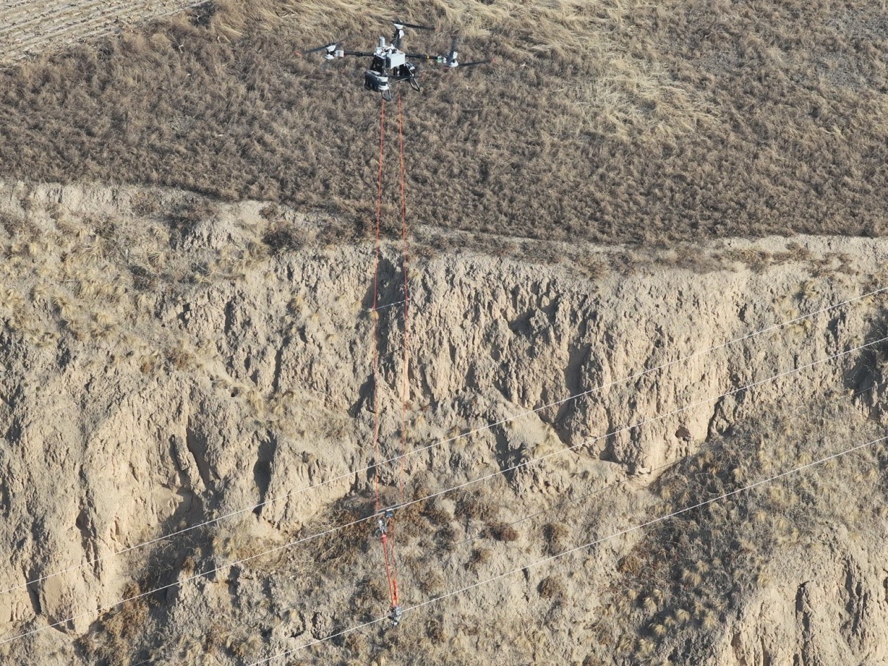 随着一阵沉稳的嗡鸣声,一架大载重无人机缓缓升空,无人机吊舱下悬挂的间隔棒在地面操作员的精准遥控下,如同一位训练有素的“空中外科医生”,自主飞抵导线间的预定手术点位。“悬停稳定,开始对接!”指令下达。通过高清图传回的画面,操作员控制无人机机械臂进行毫米级的微调,顺利完成卡具的抓取、定位与紧固。整个安装过程一气呵成,下方山谷间的村庄用电如常,对这场在头顶上进行的高空作业毫无察觉。