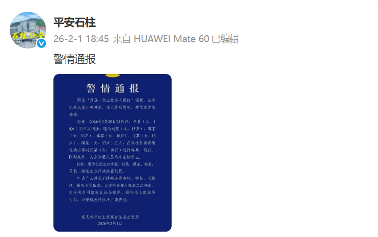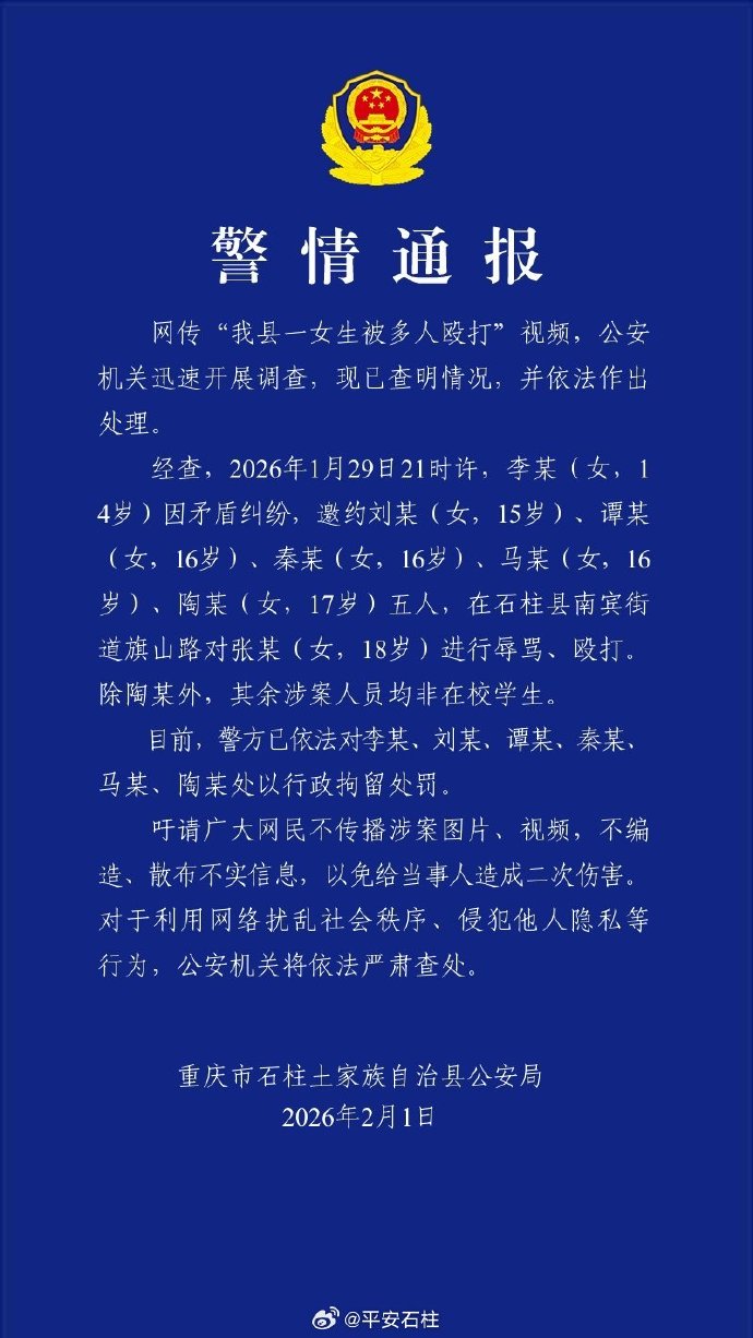 重庆石柱警方通报“一女生被多人殴打”:已行拘六人