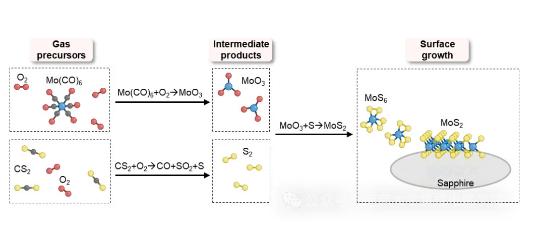 针对上述难题,团队提出全新解决方案:首次采用无氢、低碳的二硫化碳(CS2)作为硫源,从源头减少杂质引入。进一步开发oxy-MOCVD技术,通过引入氧气,在高温下与前驱体充分预反应,生成高纯度和高活性反应中间体,实现了生长动力学的精准调控。相比传统反应路径,反应能垒从2.02 eV降至1.15 eV,显著提升反应动力学速率;同时从根源上抑制含碳中间体的形成,避免碳污染,为大面积、高质量、高均匀性MoS2的外延生长筑牢根基。
