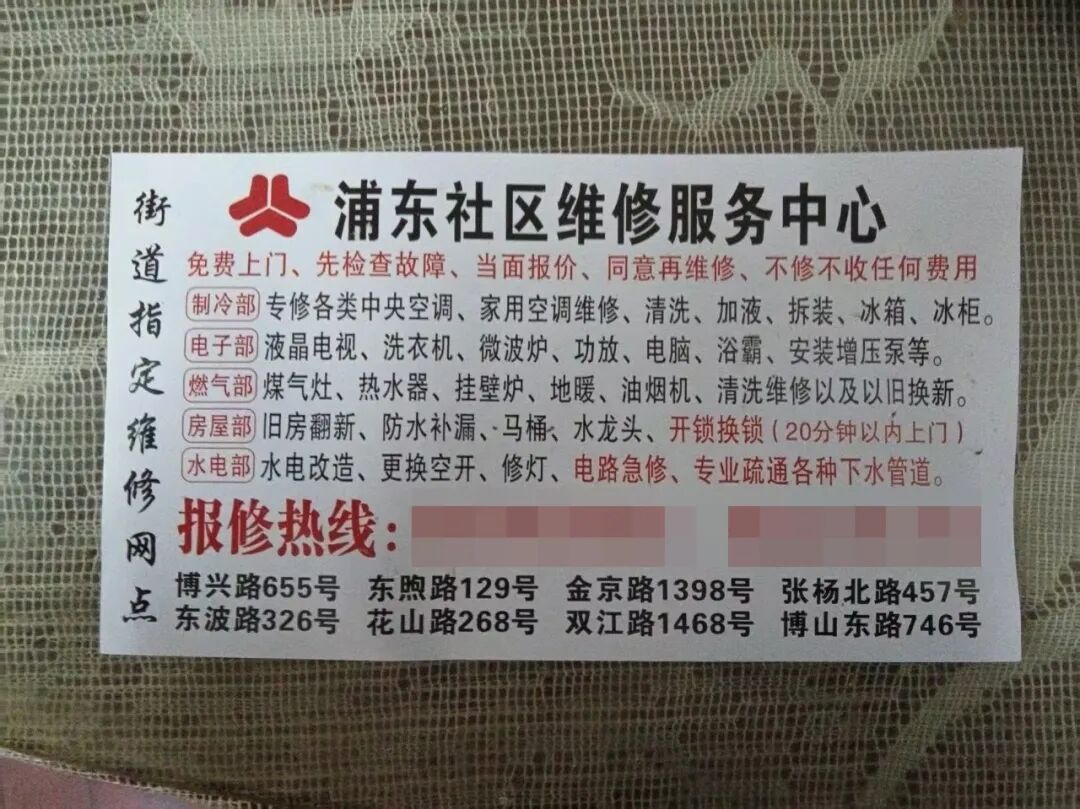 卡片上印有“浦东社区维修服务中心”和“街道指定维修网点”等,这样的表述十分含糊。浦东新区现辖12个街道、24个镇,其中并无“浦东社区”。新民晚报记者联系了曹老伯家所在的金杨新村街道和银山路第一居委会,工作人员反馈,街道及居委从未印制或发放过任何“街道指定维修网点”宣传卡片,也没有授权任何企业使用街道名义开展维修服务。