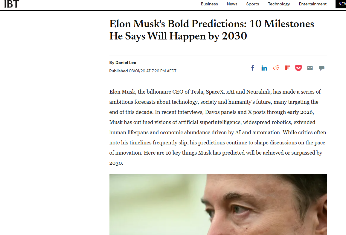 【环球网科技综合报道】3月2日,据《国际财经时报》报道,特斯拉CEO埃隆·马斯克在2026年初的采访、达沃斯论坛及社交平台发言中,公布了其对2030年前人类科技与社会的十大关键预言。尽管其过往预测常出现时间线延迟,这些雄心勃勃的构想仍成为全球创新讨论的焦点,勾勒出AI、机器人与太空探索深度融合的未来图景。
