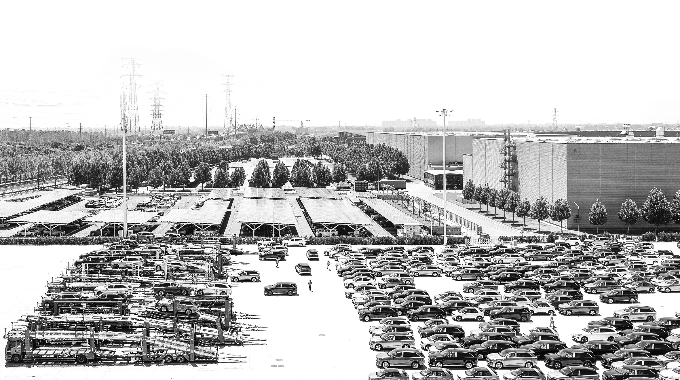 安徽合肥一家新能源汽车工厂的发车场内,整齐排列的汽车等待出厂。 (视觉中国)