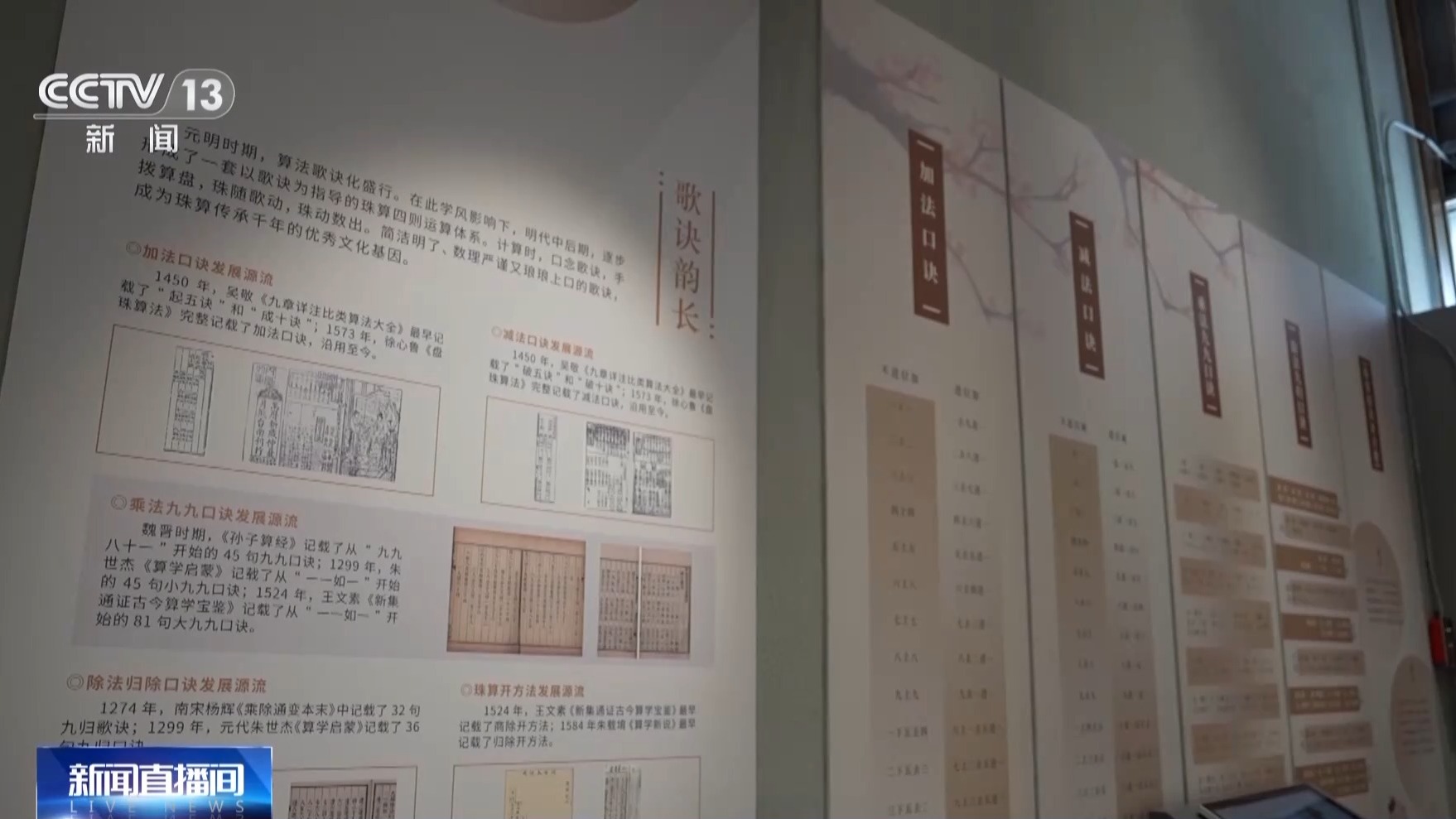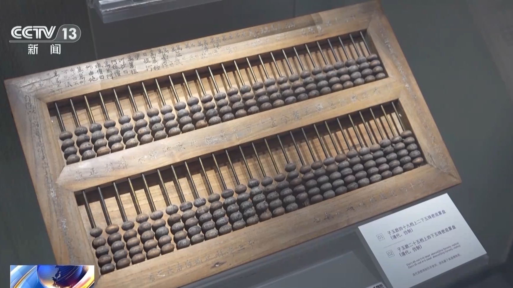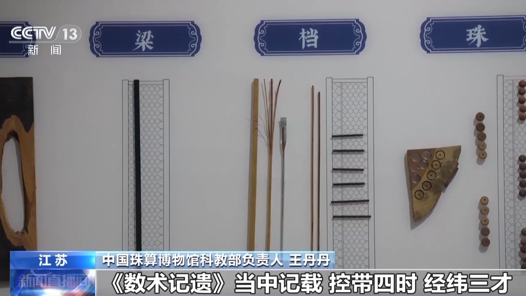 中国珠算博物馆科教部负责人 王丹丹:《数术记遗》中记载“控带四时,经纬三才”。算盘结构是一个矩形,有四个边框代表四季,“经纬三才”就是横梁把算盘分成了上中下三个部分,代表天、地、人,整个算盘可以看作一个天人合一的哲学思想。