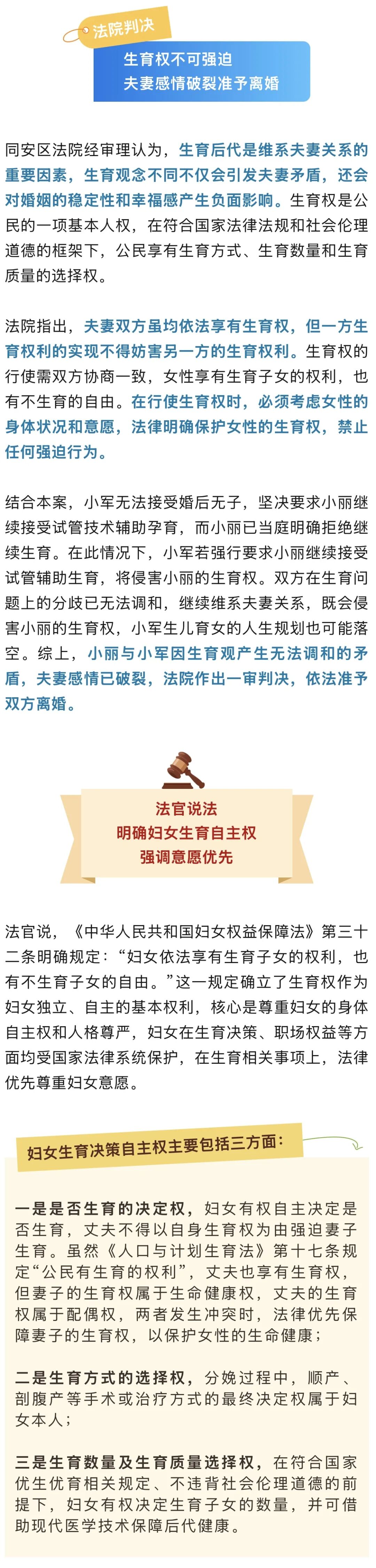 最终,小丽向法院提起离婚诉讼。庭审中,她明确表示不愿再接受试管辅助生育。而小军则不同意离婚,当庭仍劝说小丽继续接受治疗,称自己无法接受没有孩子的婚姻。