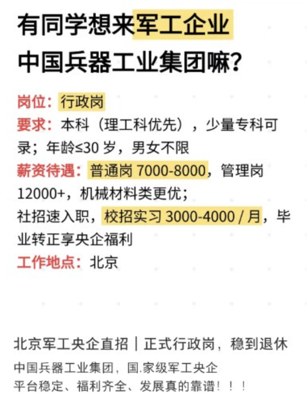 “民航局招人,企业编制太香了!”“兵器工业集团,内推优先安排”“国家能源集团,央企直签招人”……一家人力资源公司账号的主页上,不乏央企国企工作岗位信息。这些信息,不仅标注出具体岗位、薪资待遇、相关要求,更用诸如“先到先得”“入职即签订正式劳动合同”“1周面试,3到5天上岗”等字眼诱惑用户。