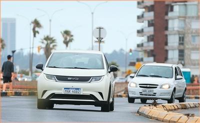 在乌拉圭首都蒙得维的亚,一辆中国电动汽车(前)在路上行驶。 尼古拉斯·塞拉亚摄(新华社发)