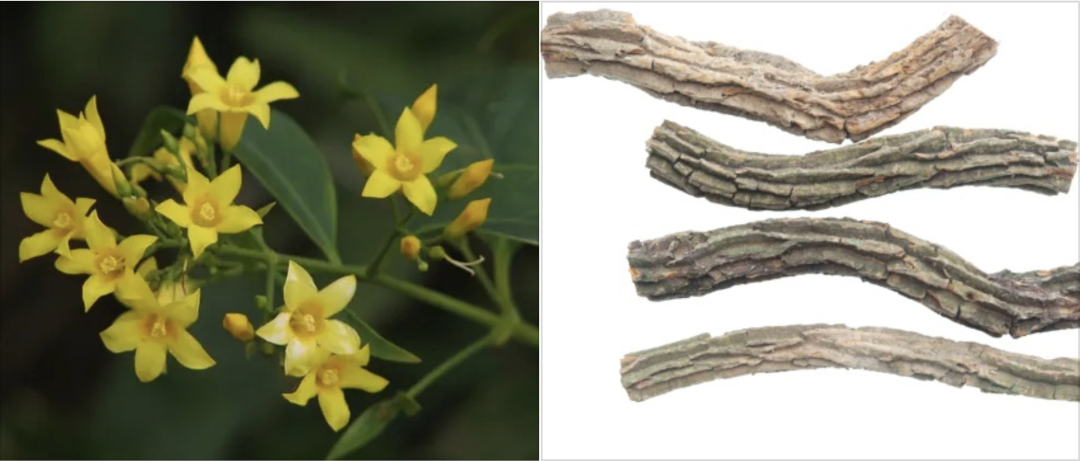 “断肠草”藤茎呈不规则圆柱形,弯曲扭转状,长短不一,少分枝。表面浅灰色、灰棕色或浅棕色,具纵皱纹,皮部呈片状开裂而显露木部。断面不整齐,皮部类白色或淡黄色,近木部颜色较深,木部黄色,可见放射状纹理、细孔及年轮。气特异,味辛苦。