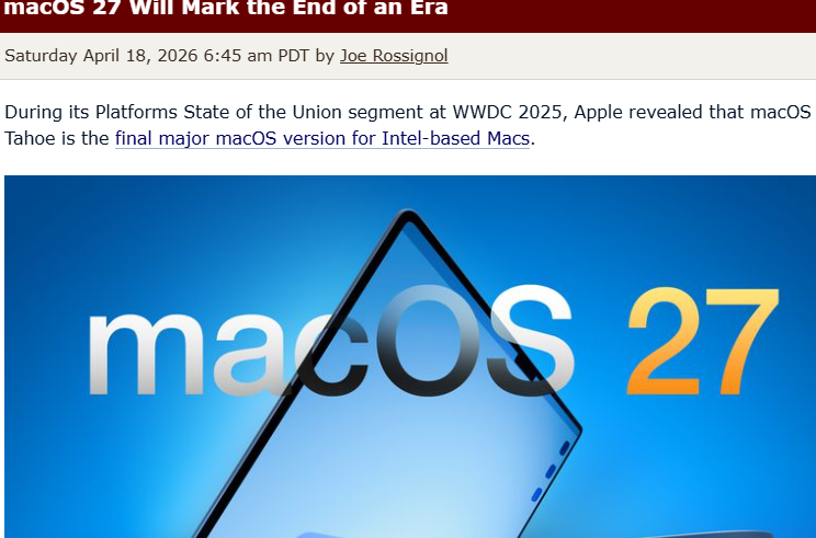 【环球网科技综合报道】4月19日消息,据外媒macrumors报道,苹果此前宣布,macOS 26 Tahoe是最后一个支持英特尔架构Mac的正式版系统,下一代macOS 27 将仅支持苹果自研芯片。