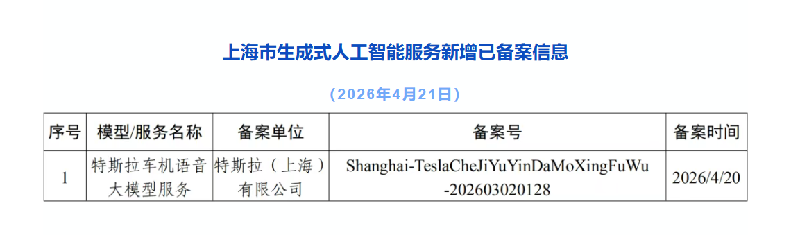 备案信息显示,特斯拉车机语音大模型服务于4月20日备案,备案单位为特斯拉(上海)有限公司。