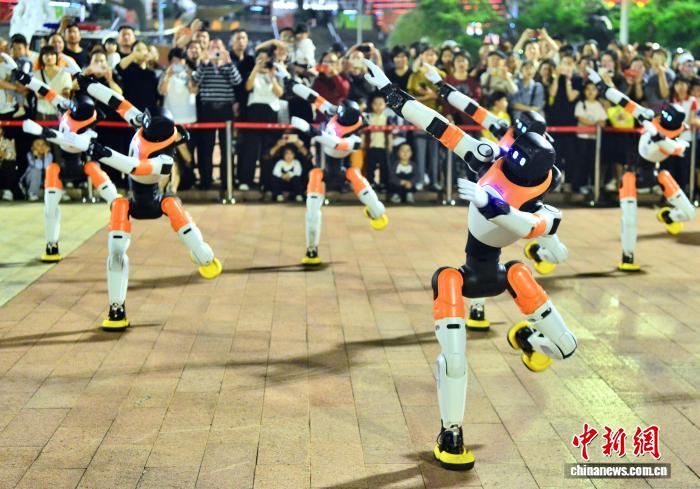 4月20日晚,一场充满科技感与观赏性的具身智能机器人路演亮相福建福州五一广场。伴随着动感十足的音乐节奏,一排排机器人挥动机械臂,动作整齐划一,赢得观众阵阵喝彩。中新社记者 张斌 摄