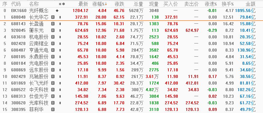 【环球网财经综合报道】4月22日,光纤概念股表现亮眼,长光华芯上涨20%封板;杭电股份、云南锗业、亨通光电、永鼎股份、光电股份等收至涨停板;长盈通、蘅东光等涨幅超过12%。