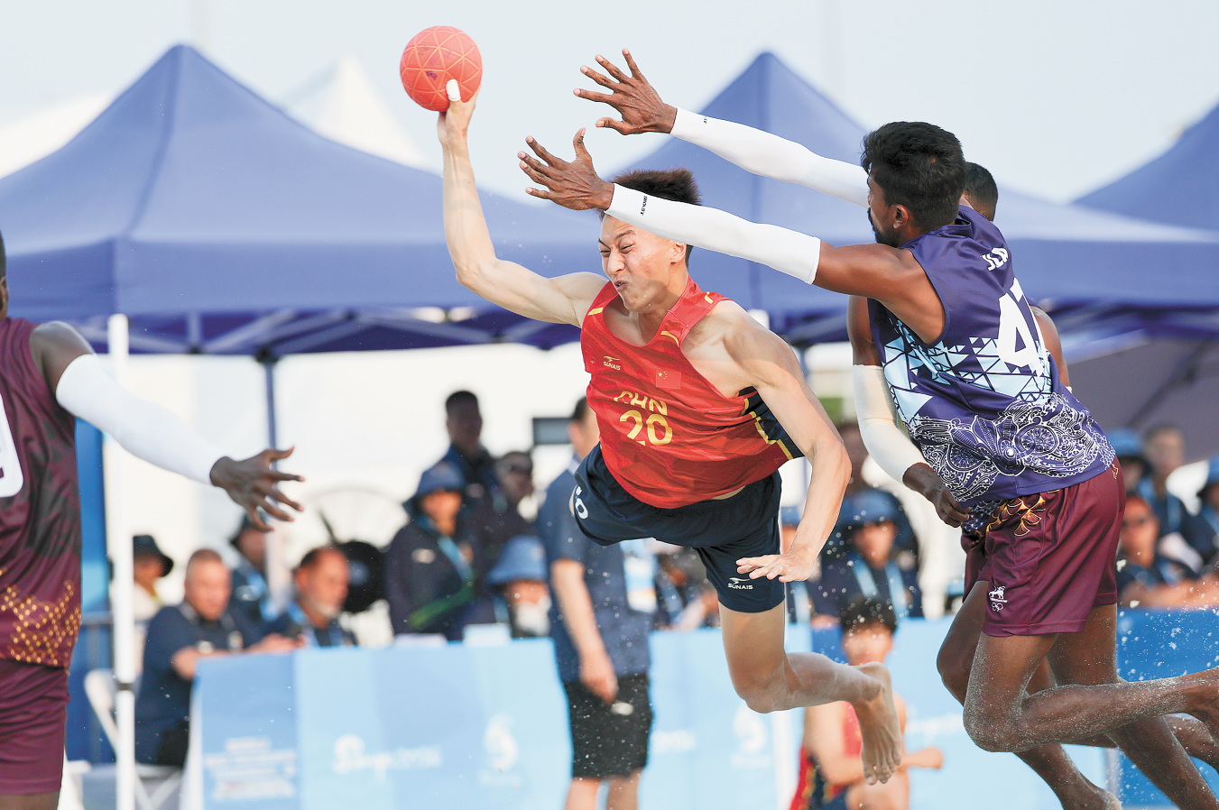 4月21日,亚沙会沙滩手球男子组小组赛中,中国队2∶0战胜斯里兰卡队。图为中国队射门。(视觉中国)