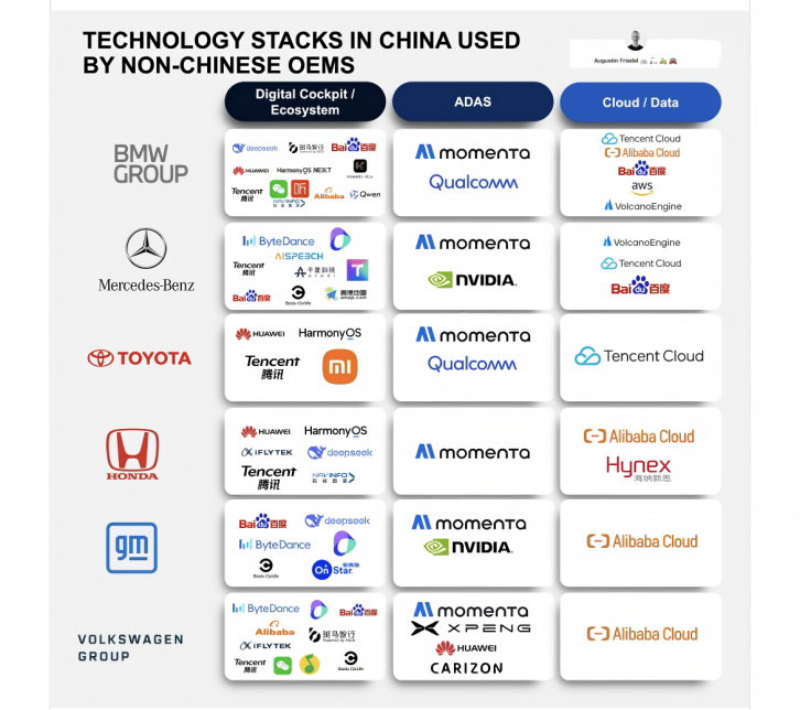 此外,近日欧洲知名管理咨询专家Augustin Friedel在海外平台分析了宝马、奔驰、丰田、本田、通用、大众在华合作的核心技术供应商,阿里巴巴、腾讯、百度、字节跳动、华为、Momenta等六大中国科技公司,已成为全球知名汽车品牌进入中国市场的智能化“标配”伙伴。其中,Momenta在ADAS领域实现全覆盖。