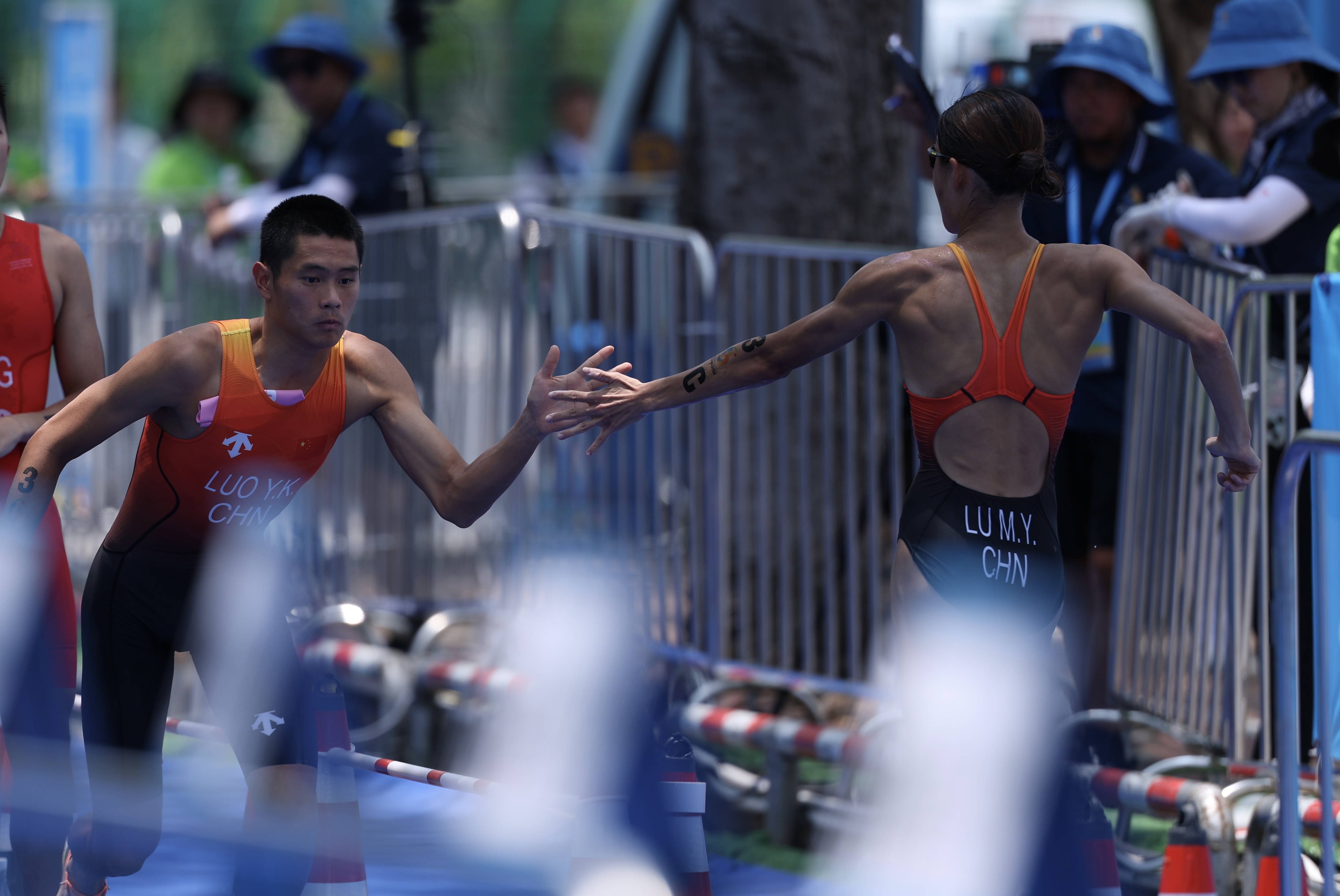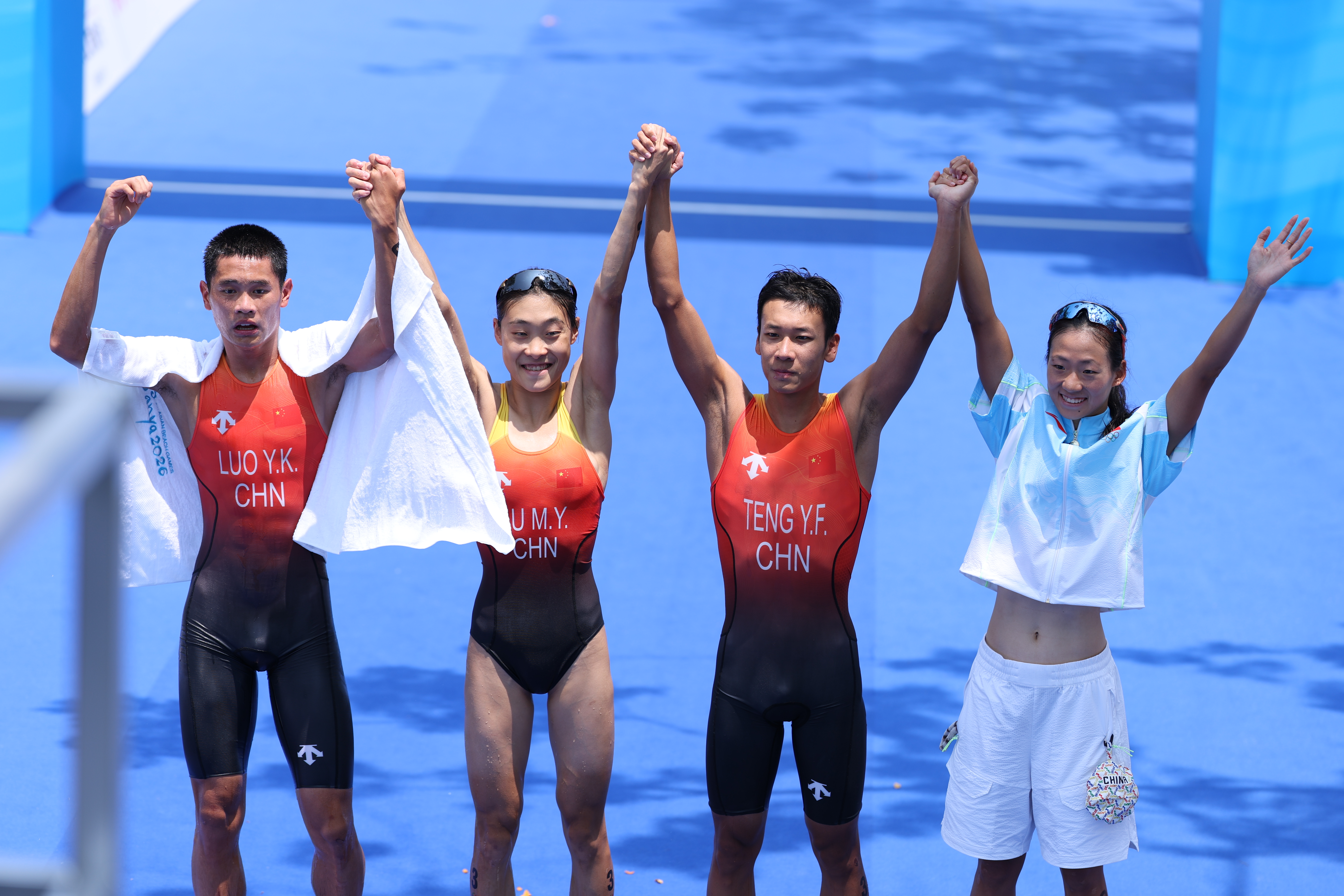 在刚刚结束的亚沙会游跑两项4x混合接力比赛中,由林鑫瑜、滕云峰、陆美伊、罗云康组成的中国队夺得冠军。至此,中国队包揽本次赛事游跑两项三枚金牌。