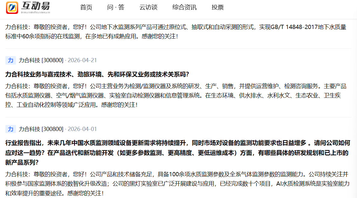 图片为力合科技在深交所投资者互动平台上披露的互动信息