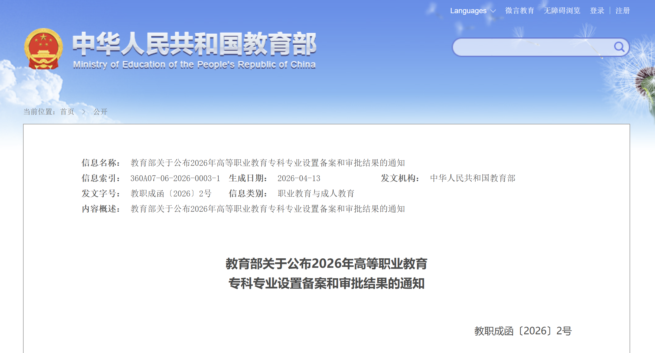 【环球网报道 记者 陈全】4月22日,记者从教育部了解到,2026年高等职业教育专科专业设置备案和审批结果于近日公布。
