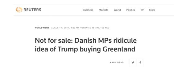 甚至还有美国大使。前美国驻丹麦大使鲁弗斯﹒吉福德(Rufus Gifford)在推特上说:“哦亲爱的上帝。作为一个热爱格陵兰岛的人,(我)已经去过那里的每一个角落9次了,(我)热爱那里的人民,(而)这是一场彻底的灾难”。