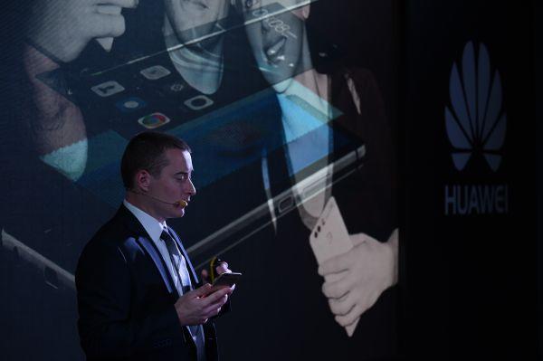 资料图片:2016年,俄罗斯莫斯科,华为手机产品负责人在发布会上介绍当时的华为新品手机。(新华社)