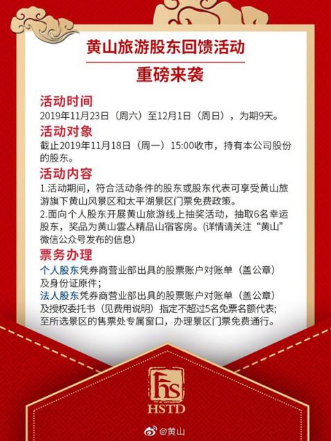11月14日,黄山旅游公司发起了股东回馈活动,通知显示,活动时间为2019年11月23日至12月1日,为期9天。截至2019年11月18日15时收市,持有黄山旅游股份的股东可享受黄山旅游旗下黄山风景区(门票价格190元)和太平湖景区门票(门票价格45元)免费政策。