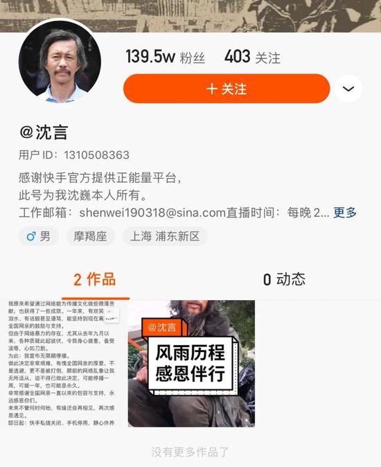 5月22日,沈巍在自己的快手号上发表了一封“致网亲的公开信”,宣布无限期停播。