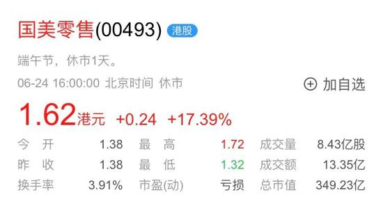 6月24日下午,消息提前泄露,国美系在A股和港股的股价一路暴涨,其中国美零售(00493.HK)收盘涨17.39%,国美金融科技(00628.HK)大涨47.30%,盘中一度涨超60%,*ST美讯(600898.SH)、中关村(00931.SZ)涨停。