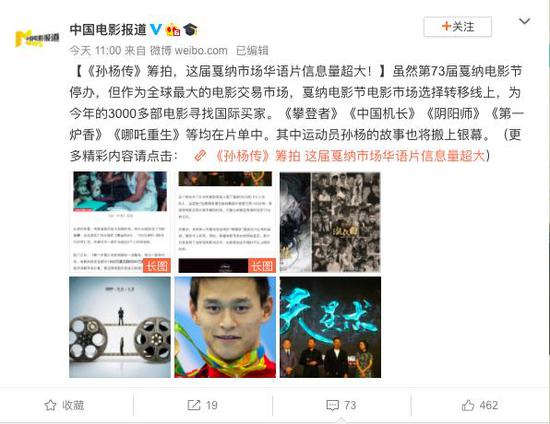 据“1905电影网”消息,虽然第73届戛纳电影节停办,但作为全球最大的电影交易市场,戛纳电影节电影市场选择转移线上,为今年的3000多部电影寻找国际买家。在线上电影市场,有家公司一口气上线了七部仍在开发和前期筹备的项目,其中就包括了《孙杨传》。
