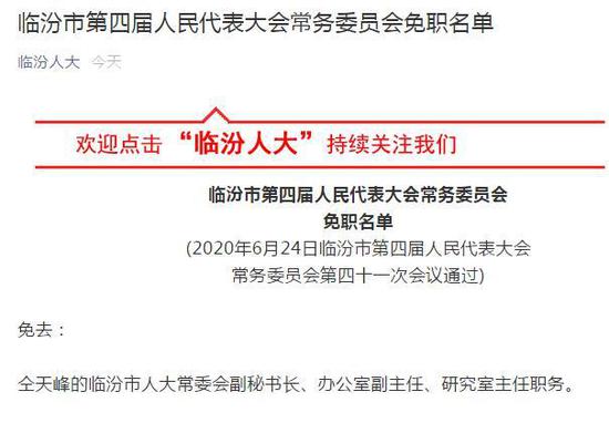 中新网6月24日电 据山西临汾市人民代表大会常务委员会官方微信消息,6月24日临汾市第四届人民代表大会常务委员会第四十一次会议通过,决定免去:仝天峰的临汾市人大常委会副秘书长、办公室副主任、研究室主任职务。同一会议上,还通过了免去李晋平的临汾市教育局局长职务的决定。