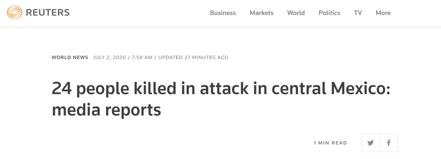 路透社:据媒体报道,墨西哥中部发生袭击事件,造成24人死亡