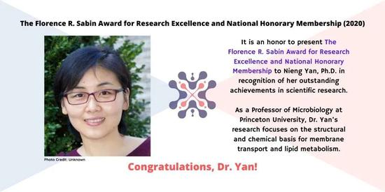 今年8月,女科学家组织GWIS公布了2020年度的荣誉会员奖(共包含三个奖项),将其中的佛罗伦斯·萨宾杰出研究奖授予了颜宁,以表彰她在科研领域的杰出贡献。