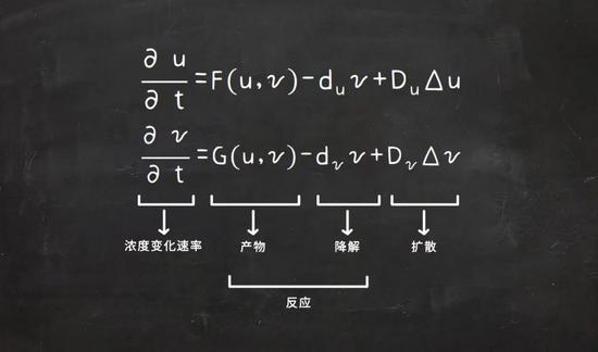 反应扩散方程,它描述了反应扩散理论中的两种化学物质是如何进行反应和扩散的。| 参考来源:[7]
