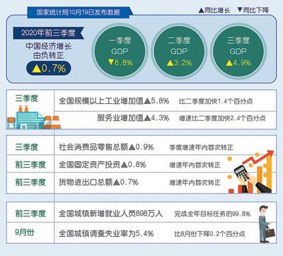 “初步核算,前三季度国内生产总值722786亿元。按可比价格计算,同比增长0.7%,经济增速年内首次由负转正,供需关系逐步改善,市场活力动力增强,就业民生较好保障,国民经济延续稳定恢复态势。”10月19日,前三季度国民经济运行数据发布,国家统计局新闻发言人刘爱华介绍了有关情况。