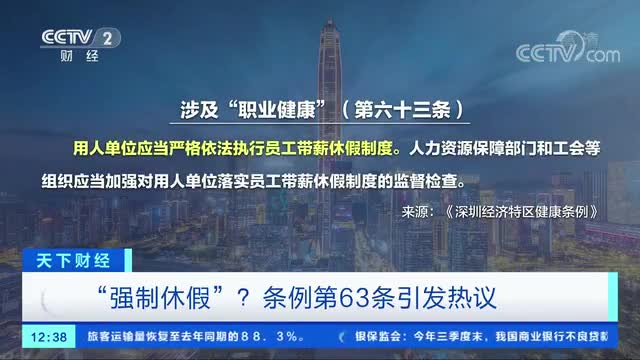 近日,《深圳经济特区健康条例》表决通过,这是国内首部地方性健康法规,将从2021年1月1日起施行。总共133条内容,其中引发广泛热议的是第63条,也就是被外界解读为“强制休假”的条款。