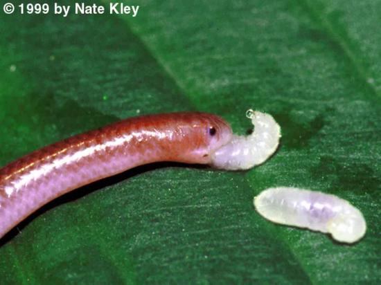 然而,并不是所有蛇都倾向于吞咽大猎物的。在蛇类家族中,也不乏长着“樱桃小口”的成员,由于它们的食性专一,也不需要将嘴张得很大,只能吃很细小的食物,采取“小食多餐”的策略。例如,一些盲蛇以白蚁卵为食,它们的嘴就只能张开很小的幅度。