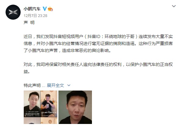 小鹏汽车跌2.23%。小鹏汽车7日晚间发布声明称,近日,公司发现抖音短视频用户(抖音ID:环绕地球的于哥)连续发布大量不实信息,并对小鹏汽车的经营情况进行毫无证据的揣测和造谣。这种行为严重损害了小鹏汽车的声誉,造成非常恶劣的舆论影响。对此,公司将保留对相关责任人追究法律责任的权利,以保护小鹏汽车的正当权益。