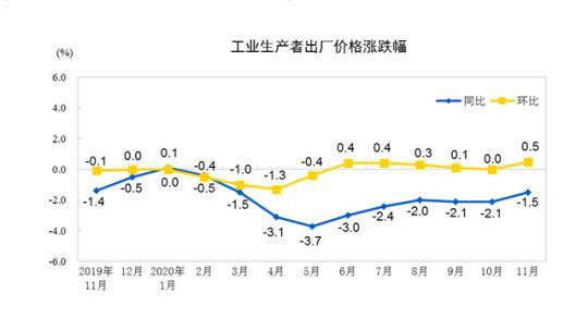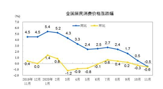9日,国家统计局发布了11月份全国CPI(居民消费价格指数)和PPI(工业生产者出厂价格指数)数据。CPI同比下降0.5%,环比下降0.6%;PPI同比下降1.5%,环比上涨0.5%。