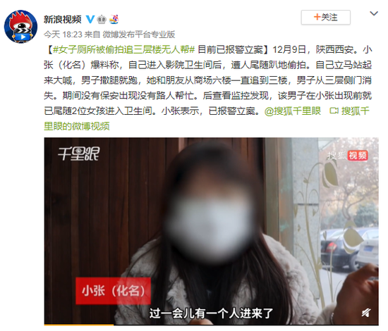 12月9日,陕西西安。小张(化名)爆料称,自己进入影院卫生间后,遭人尾随趴地偷拍。自己立马站起来大喊,男子撒腿就跑,她和朋友从商场六楼一直追到三楼,男子从三层侧门消失。期间没有保安出现没有路人帮忙。后查看监控发现,该男子在小张出现前就已尾随2位女孩进入卫生间。小张表示,已报警立案。
