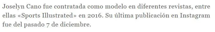 Cano离世的消息据悉是由一位名叫Nelssie Carrillo的八卦记者通过Instagram发布的,之后还得到了她的一名模特朋友的确认。尽管她的家人和公司还没有就此事置评,她的粉丝们已经开始在分享悼念信息,参与悼念的人数甚至很快就超过1200万人。