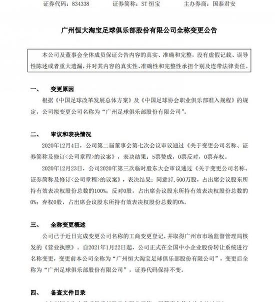 公司已于近日完成变更公司名称的工商变更登记,并取得广州市市场监督管理局核发的《营业执照》。自2021年1月22日起,公司正式在全国中小企业股份转让系统进行名称变更,变更前本公司全称为“广州恒大淘宝足球俱乐部股份有限公司”,变更后全称为“广州足球俱乐部股份有限公司”,证券代码保持不变。 |