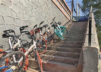 共享单车随意停放在阶梯。资料图片/新京报记者 吴宁 摄