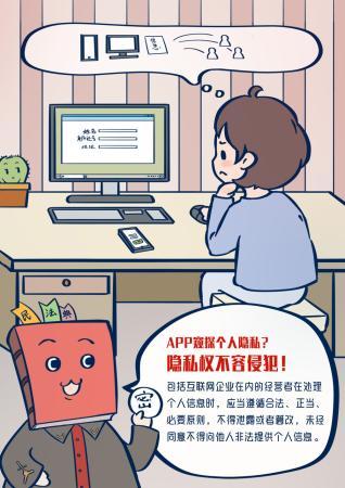 【一“典”就通】李胜利表示,民法典总则中明确“自然人的个人信息受法律保护”;后面又专门设置了“隐私权和个人信息保护”一章,其中规定,要求包括互联网企业在内的经营者在处理个人信息时,应当遵循合法、正当、必要原则,不得泄露或者篡改其收集、存储的个人信息;未经同意不得向他人非法提供个人信息。这些内容为经营者设定了法律义务,要求从源头上为每位消费者的隐私及个人信息提供保护,防止泄露。(漫画设计:陈恬雨、刘旭峰) |