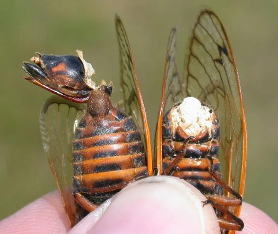 如果是雌性被感染了,情况可能更加“刺激”。雌性因为需要存放卵,腹部的结构要稍微比雄性紧实一点,生殖器也能得到部分保留。不过,当雄性来与雌性交配时,雌性生殖器已经经受不住原本正常的交配过程,往往会脱落并被雄性带走。根据Kasson的观察,这些携带了雌性生殖器的雄蝉不仅会感染真菌,并且有一些会像雌性一样扇动翅膀,吸引其他雄性,实现雄雄传染。