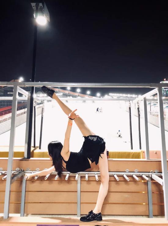 2015年,她在训练之余尝试了倒转一字马的动作——将双腿摆开支撑在过道两侧的墙壁上,身体朝下弯曲,双手固定在一只脚上。